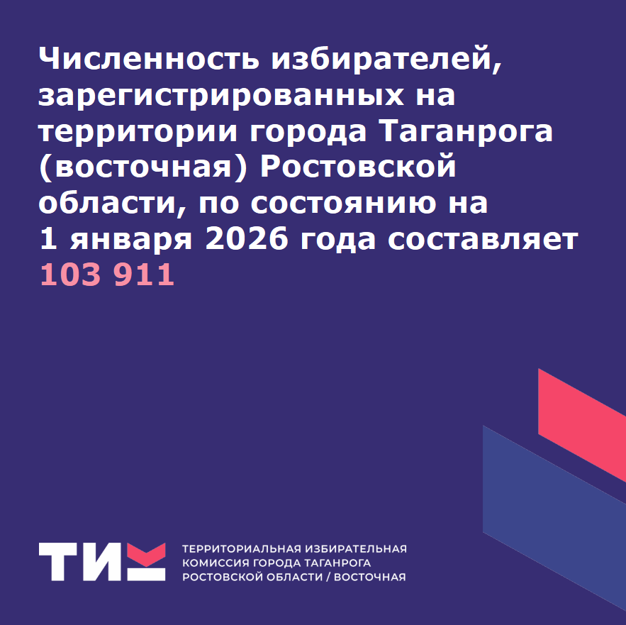 12.01.2026В соответствии с пунктами 2, 10 статьи 16 Федерального закона от 12 июня 2002 года № 67-ФЗ «Об основных гарантиях избирательных прав и прав на участие в референдуме граждан Российской Федерации» по состоянию на 01 января 2026 года численность избирателей, зарегистрированных на территории принадлежащей Территориальной избирательной комиссии города Таганрога (восточная) Ростовской области, составила 103 911 человек.