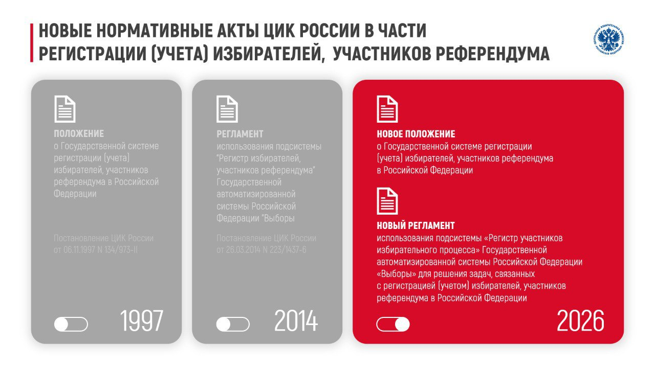 26.02.2026ЦИК России утверждено новое Положение о Государственной системе регистрации (учета) избирателей, участников референдума в Российской Федерации.